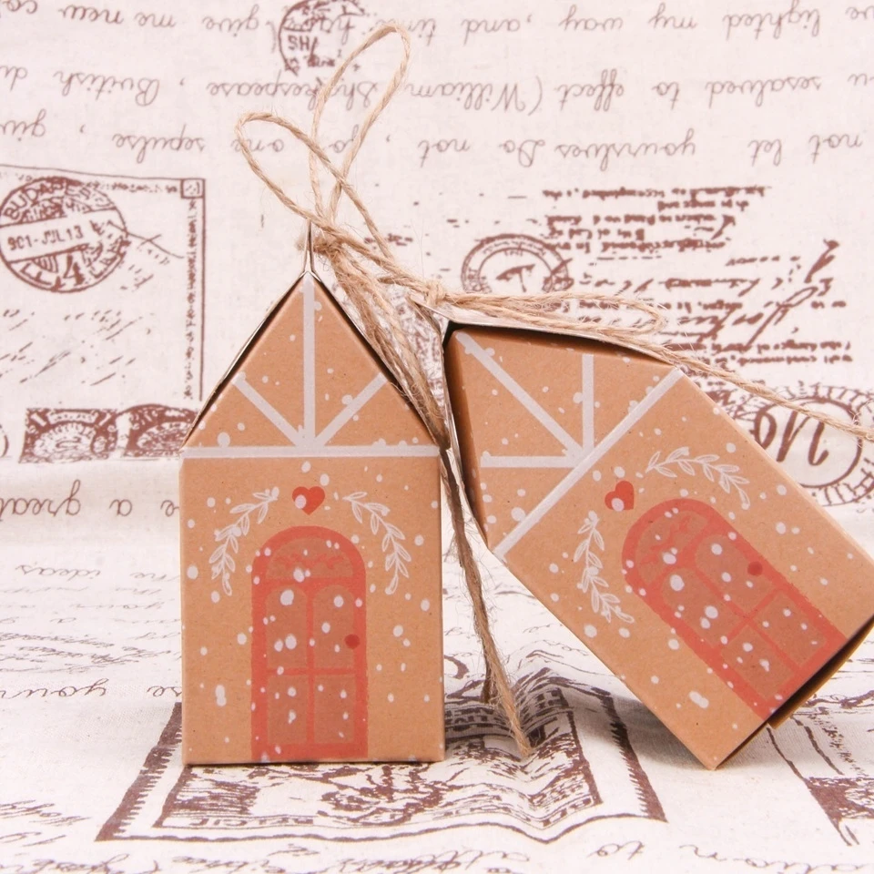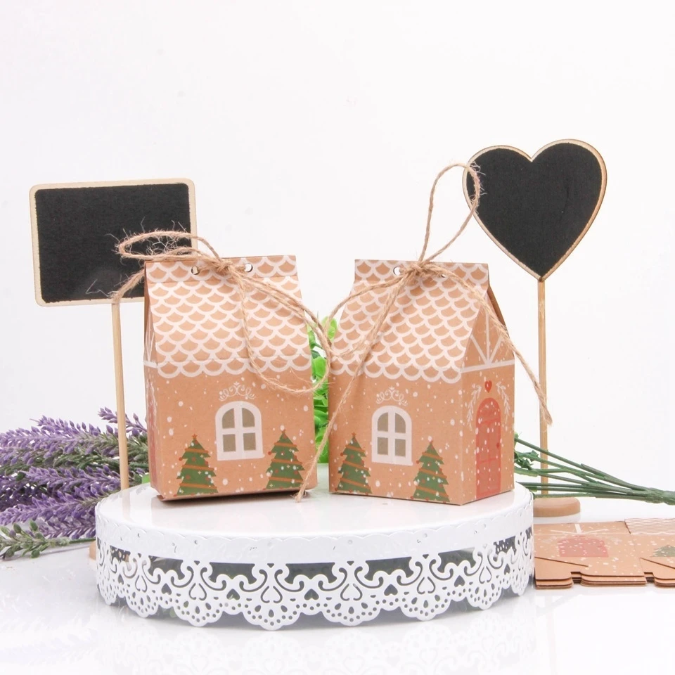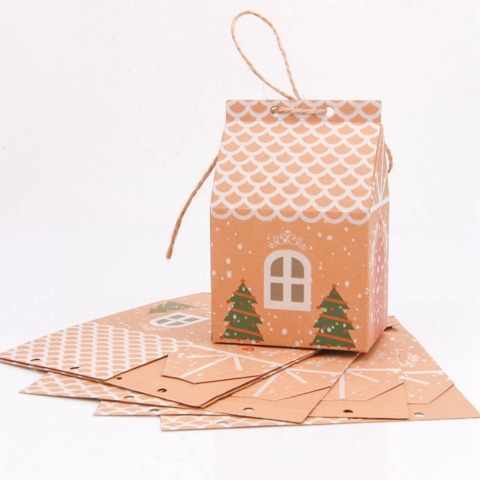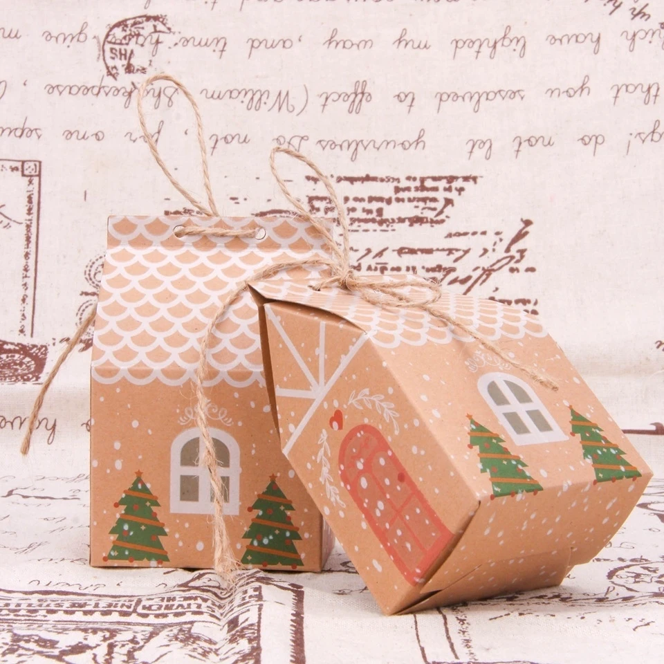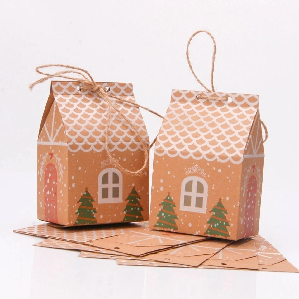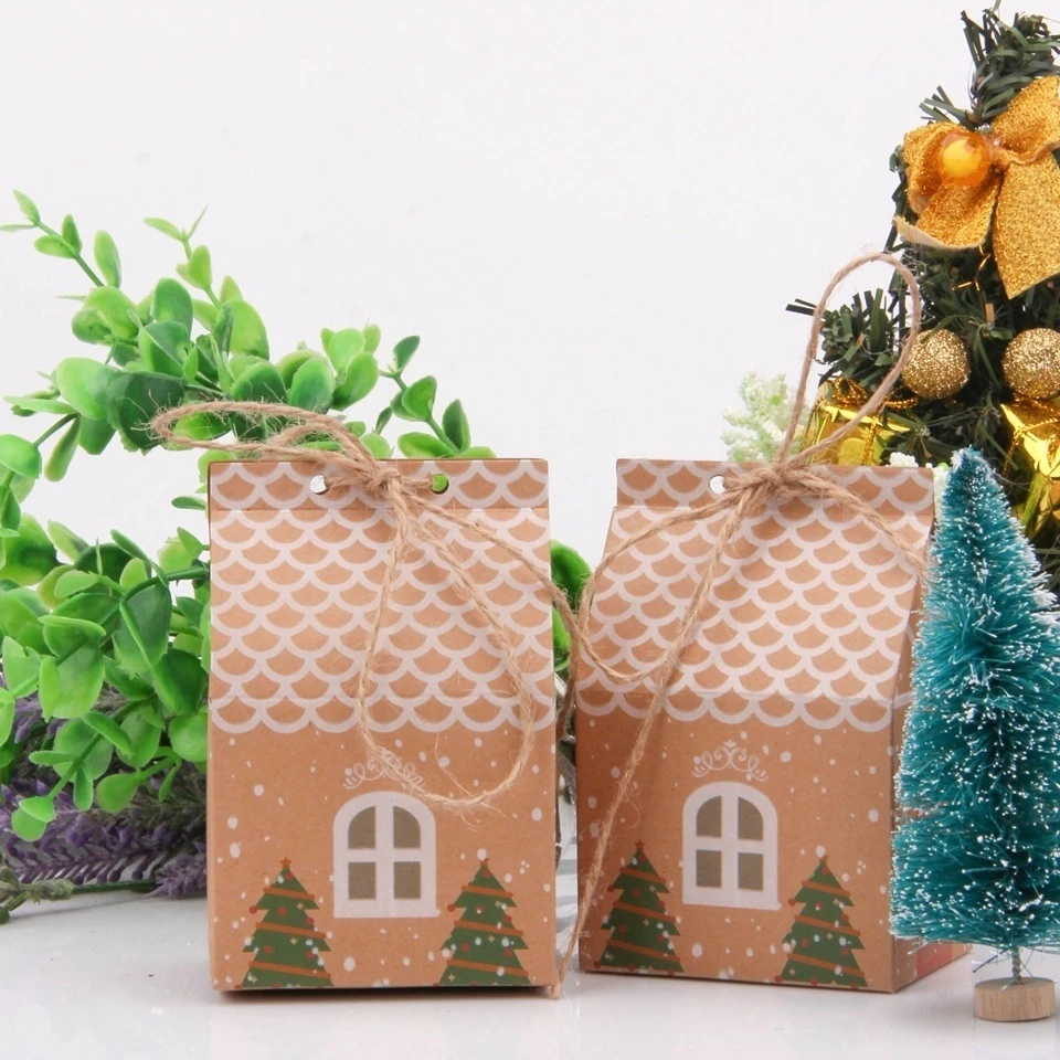 5PCS House Shape Christmas Candy Gift Bags With Ropes Xmas Tree Cookie Bags Merry Christmas Guests Packaging Boxes Party Decor